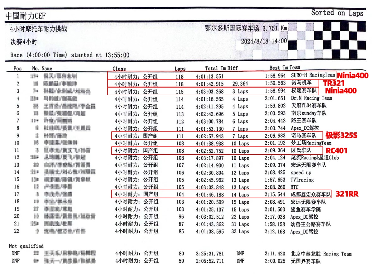 本次摩托车中国耐力活动(CEF)2024鄂尔多斯站在鄂尔多斯赛车小镇举行,吸引国内28支车队、90名运动员参加。在这场摩托届盛事中,诺马再次成为焦点,我们的明星车型极影325S在国产组中越级挑战,并以卓越的性能和稳定的发挥成功取得了300cc-400cc国产组冠军,展现了诺马在技术研发和产品品质上的深厚底蕴。极影325S的最速圈速达到了惊人的2:06.983,远超同组别的其他车型,这一成绩无疑是对诺马技术实力的一次有力证明。